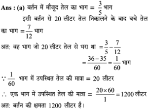 12. एक तेल का बर्तन 3/5 भरा है। जब इससे 20 लीटर तेल का उपयोग किया जाता है, तो यह 7/12 भरा होता है। बर्तन की क्षमता ज्ञात करें?