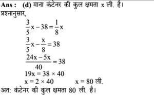 13. पानी का एक कंटेनर 3/5 भरा था, जब उसमें से 38 लीटर पानी निकाल लिया जाता है, तो यह सिर्फ 1/8 भाग भरा रह जाता है। कंटेनर की कुल क्षमता कितनी है?