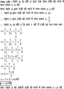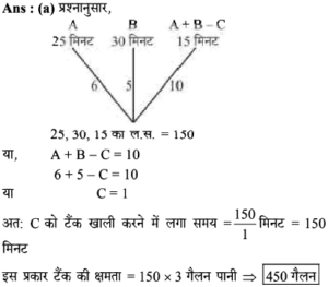14. दो पाइपों A और B एक टैंक को क्रमशः 25 मिनट और आधे घंटे में भर सकते हैं और पाइप C तीन गैलन प्रति मिनट खाली कर सकता है। यदि तीनों पाइपों को एक साथ संचालित किया जाता है, तो टैंक 15 मिनट में भर जाता है। टैंक की धारिता ज्ञात कीजिए।
