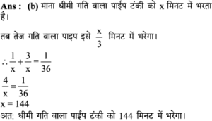 16. एक टंकी को दो पाइपों से भरा जा सकता है जिसमें से एक पाइप दूसरे की तुलना में तीन गुना तेजी से भर सकता है। यदि दोनों पाइप एक साथ टंकी को 36 मिनट में भर देते हैं, तो धीमा पाइप अकेले टंकी को कितने समय में भर देगा?