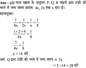 17. P पाइप, पाइप Q से दो गुना तेज काम करता है और Q पाइप R पाइप से दोगुना तेज काम करता है। तीनों पाइप एक साथ किसी टंकी को 8 घंटे में भर देते हैं। Q को अकेले उसी टंकी को भरने में कितना समय लगेगा?