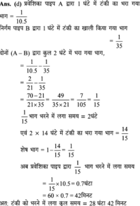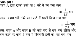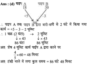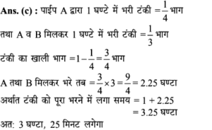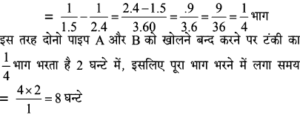 1. पाइप A किसी खाली टंकी को अकेले 4 घण्टे में भर देता है जबकि पाइप B के साथ मिलकर यह उसे 3 घंटे में भर देता है। पाइप A को एक घंटे चलाने के पश्चात् पाइप B को भी खोल दिया जाता है तो टंकी को भरने में कुल कितना समय लगेगा?