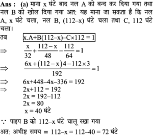 2. दो पाइप A और B एक खाली टंकी को क्रमश: 32 और 48 घंटों में भर सकते हैं। जब कोई और पाइप कार्य नहीं कर रहा है तो पाइप C पूरी टंकी को 64 घंटों में खाली कर सकता है। शुरूआत में, जब टंकी खाली थी तो पाइप A और पाइप C को चालू किया गया था। कुछ घंटों के बाद, पाइप A को बंद कर दिया गया था और उसी समय पाइप B को चालू कर दिया गया था। ऐसा करते हुए टंकी को भरने के लिए 112 घंटे लगे थे। पाइप B को कितने घंटों तक चालू रखा गया था?