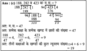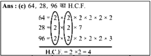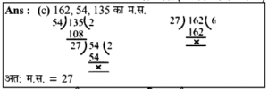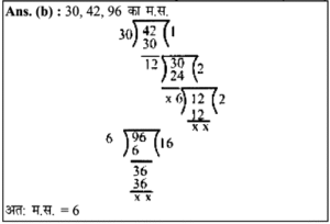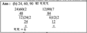 Ans : (c) प्रश्नानुसार चॉकलेट, बिस्कुट, आइसक्रीम की संख्या क्रमश: 24, 36 तथा 60 है। विद्यार्थियों की संख्या = 24, 36 तथा 60 का म. स. 12