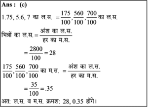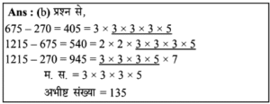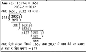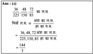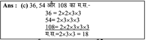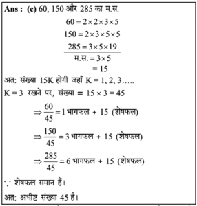 लघुत्तम समापवर्त्य एवं महत्तम समापवर्तक | Online Test – 04 Leave a Comment / Reasoning Question / By admin 0% Rajasthan GK In Hindiलघुत्तम समापवर्त्य एवं महत्तम समापवर्तक | Online Test - 04 1 / 201. 20, 28 और 48 का म.स. है: 8 2 1 4 Ans : (d) 20, 28 और 48 का म.स. 20=2x2x5 28 =2x2x7 48 = 2x2x2x2x3 म.स.प= 2x2 = 4 अत: 20, 28 और 48 का म.स. प. 4 है।2 / 202. 36, 54 और 108 का म.स. कितना होगा? 6 9 18 12 3 / 203. 36, 72 और 126 का म.स.प. क्या है?4.71.= 2 * 3 * 3 = 18 18 36 9 12 Ans : (a) दी गई संख्याएँ = 36, 72, 126 अर्थात, 36 = 2 × 2 × 3 × 3 72 = 2 × 2 × 2 × 3 × 3 126 = 2 × 3 × 3 × 7 अभीष्ट म.स.प. = 2 × 3 × 3 = 184 / 204. सबसे बड़ी संभावित लंबाई ज्ञात कीजिए, जो 2m 76 cm, 5m 52cm, 11m 96 cm की लंबाईयों को पूरा-पूरा मापने के लिए उपयोग में लाया जा सके। 92 cm 11.96 cm 92 m 1196 cm Ans: (a) 2 मीटर 76 सेमी. = 2 × 100 + 76 = 276 सेमी. 5 मीटर 52 सेमी. = 5 × 100 + 52 = 552 सेमी. 11 मीटर 96 सेमी. = 11 × 100 + 96 = 1196 सेमी. अतः सबसे बड़ी सम्भावित लम्बाई = 276, 552 तथा 1196 का म.स. = 92 सेमी.5 / 205. चार अंकों की बड़ी से बड़ी संख्या ज्ञात कीजिए जिसको 8, 12, 16 से विभाजित किया जाए तो 2 शेष बचता है। 9984 9985 9986 9987 6 / 206. वह बड़ी से बड़ी संख्या ज्ञात कीजिए जिससे 1580 तथा 3800 को विभाजित करने पर शेष क्रमशः 8 तथा 1 बचता है- 262 131 65.5 393 Ans : (b) बड़ी से बड़ी संख्या = (1580-8) तथा (3800-1) का म.स. = 1572 तथा 3799 का म.स. = 1317 / 207. ऐसी सबसे बड़ी संख्या ज्ञात कीजिए, जिसके द्वारा 76, 151 और 226 का भाग करने पर प्राप्त होने वाले सभी शेष समान होते है- 69 60 75 70 Ans : (c) यदि शेष समान है, तो 226-151= 75 × 1 151-76 = 75 × 1 226-76 = 75 × 2 75, 75, 150 का म.स. अभीष्ट संख्या अभीष्ट संख्या = 758 / 208. वह बड़ी से बड़ी संख्या क्या है, जिसके द्वारा 1657 और 2037 को विभाजित करने पर शेष क्रमशः 6 और 5 बचता है? 150 125 127 130 9 / 209. वो बड़ी से बड़ी संख्या बताएँ, जिससे संख्या 200 और 432 को विभाजित करने पर क्रमशः 2 और 3 शेष रहे। 24 8 33 44 10 / 2010. वह सबसे बड़ी संख्या कौन सी है जिससे 63, 77 और 98 को विभाजित किए जाने पर क्रमशः 3, 5 और 2 शेष बचते हैं? 10 9 6 8 Ans: (c) 63 - 3 = 60 77 - 5 = 72 98 - 2 = 96 60, 72, 96 का म.स. = 12 जबकि विकल्प में 12 नहीं है लेकिन 12, 6 से विभाजित होगा।अतः विकल्प (c) सही है।11 / 2011. कपड़े के तीन टुकड़ों की लंबाई क्रमश: 1.26 मीटर, 1.98 मीटर और 1.62 मीटर है। कितनी अधिकतम लम्बाई द्वारा इन्हें पूरा-पूरा मापा जा सकता है? 12 से.मी. 14 से.मी. 16 से.मी. 18 से.मी. 12 / 2012. 50 पेन, 80 पेंसिल और 65 पैमाने समान रूप से कुछ छात्रों के बीच में वितरित किये गये और पाया गया कि प्रत्येक आइटम से 5 वितरित नहीं किये गये हैं। छात्रों की संख्या का पता लगाएं। 5 20 15 10 Ans : (c) प्रश्न से, 50 - 5 = 45 80 - 5 = 75 65 - 5 = 60 45, 75 व 60 का म.स. 15 अतः छात्रों की सं. = 1513 / 2013. आपके पास 20 बड़ी तथा 16 छोटी डायरियाँ हैं तथा दोनों प्रकार की डायरियों से आप उपहार पैकेट बनाना चाहते है। बिना किसी डायरी को छोडे आप कितने अधिकतम उपहार बना सकते हैं 5 4 3 2 14 / 2014. वह बड़ी से बड़ी संख्या ज्ञात कीजिए, जिससे 270, 675 और 1215 को विभाजित किया जाए तो प्रत्येक दशा में समान शेष बचता है। 45 135 270 75 15 / 2015. वह बड़ी से बड़ी संख्या ज्ञात कीजिए, जिससे 60, 150 और 285 को विभाजित करने पर प्रत्येक में समान शेष आए। 30 25 45 55 16 / 2016. वह बड़ी से बड़ी संख्या ज्ञात कीजिए जिसे 391 औ