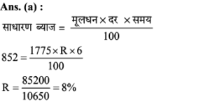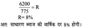 10. 6 वर्षों के लिए निवेश की गई धनराशि रुपए 1775 पर रुपए 852 ब्याज मिलता है। प्रति वर्ष साधारण ब्याज दर क्या है?