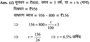 3. रुपए 800 की राशि साधारण ब्याज की एक निश्चित दर पर 3 वर्ष में रुपए 956 हो । दर ज्ञात करें?