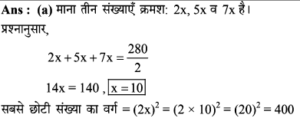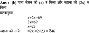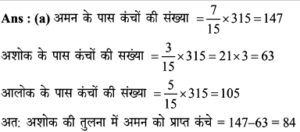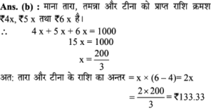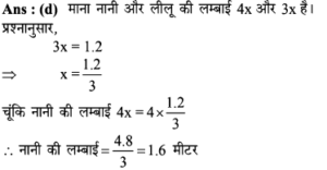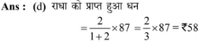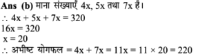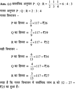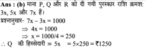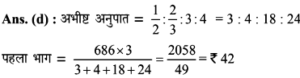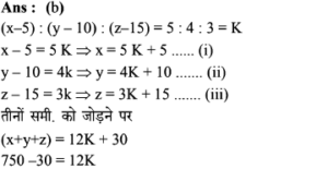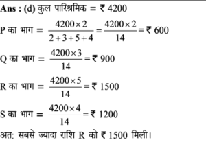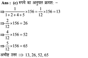 Aptitude | अनुपात समानुपात (Ratio & Proportion) | Online Test – 05 Leave a Comment / Math Aptitude / By admin 0% Rajasthan GK In HindiAptitude | अनुपात समानुपात (Ratio & Proportion) | Online Test - 05 1 / 201. एक 84 मीटर लंबी किसी रस्सी को 7 : 5 के अनुपात में बांटा जाए तो लंबे टुकड़े की लंबाई (मीटर में) होती है- 42 50 45 49 2 / 202. एक क्लब में लड़कों और लड़कियों का अनुपात 3 : 2 है। वहां उपस्थित लोगों की कुल संख्या कितनी हो सकती है? 18 25 16 24 3 / 203. यदि जेम्स और राधा के बीच में 87 को 1:2 के अनुपात में विभाजित किया गया है, तो राधा को कितने रुपये मिलेंगे? 29 57 59 58 4 / 204. 69 की राशि जेसन और रूहाना में 1:2 में विभाजित की गई। रूहाना को कितनी राशि प्राप्त हुई? 23 46 40 45 5 / 205. नानी और लीलू की लंबाई का अनुपात 4 : 3 है। यदि लीलू की लंबाई 1.2 मीटर है, तो नानी की लंबाई कितनी है? 1.8 मीटर 0.9 मीटर 2 मीटर 1.6 मीटर 6 / 206. यदि एक त्रिभुज की सभी भुजाओं की लंबाई का अनुपात 2:3:4 तथा इसका परिमाप 63 सेमी है, तो सबसे बड़ी भुजा की लंबाई ज्ञात करें। (a) 30 सेमी. (b) 28 सेमी. (c) 21 सेमी. (d) 14 सेमी. 7 / 207. एक काम को करने में P, Q, R और S की कार्य क्षमताओं का अनुपात 23:54 है। किसी कार्य के लिए दिया गया पारिश्रमिक 4200 है। किसे सबसे ज्यादा राशि मिली और कितनी राशि मिली ? P, 2000 Q, 2000 S,1600 R,1500 8 / 208. यदि 750 को x, y और z तीन भागों में इस प्रकार विभाजित किया जाता है कि (x - 5) : (y - 10) : (z-15 = 5 : 4 : 3 हो, तो क्रमश: x, y और 2 का हिस्सा ज्ञात करें। 250, 200, 150 305, 250, 195 310, 170, 240 300, 240, 180 9 / 209. 117 की राशि को P, Q और R के बीच 1/2:1/3:1/4 अनुपात के बजाय गलती से 2:3:4 के अनुपात में विभाजित किया गया। इस विभाजन में कौन सबसे अधिक राशि और कितना प्राप्त करता है? P, 28 R, 27 R, 25 Q, 35 10 / 2010. X, Y और Z साथ मिलकर किसी कार्य को पूरा करते हैं और 210 कमाते हैं। यदि X, Y और Z के कार्य का अनुपात 4:6:5 है। तो Z को मिली राशि कितनी है? 40 70 44 45 11 / 2011. X, Y और Z के बीच क्रमश: 4:5:6 के अनुपात में 900 की राशि वितरित की गई है। X और Z की राशि के बीच कितना अंतर होगा? 500 150 120 350 12 / 2012. अमन, अशोक और आलोक के बीच 315 कंचे 7:3: 5 के अनुपात में क्रमशः वितरित किए जाते हैं। अशोक की तुलना में अमन को कितने अधिक कंचे मिले ? 84 147 63 42 13 / 2013. यदि त्रिभुज के कोण 5: 6:7 के अनुपात में हैं तो त्रिभुज को कहा जाता है। समभुज त्रिकोण न्यून कोण त्रिभुज समकोण त्रिभुज अधिक कोण त्रिभुज 14 / 2014. यदि 686 को चार भागों में विभाजित किया जाता है, जिनके अनुपात 1/2 : 2/3 : 3: 4 है, है, तो पहला भाग क्या होगा? 48 56 52 42 15 / 2015. 1000 की धनराशि को तारा, तमन्ना, टीना के बीच 4:5:6 के अनुपात में वितरित किया जाता है। तारा और टीना की राशियों के बीच अंतर कितना है? 250 133.33 150 134 16 / 2016. 156 को 1:2:4:5 के अनुपात में विभाजित कीजिए। निम्न में से किस क्रम से रुपये का अनुपात प्राप्त होगा? 13,26,53, 64 13,26,51, 66 13,26,52, 65 13,25,53, 65 17 / 2017. 130,3:6:8:9 के अनुपात में बंटा है। प्रत्येक को दी गई राशि है। 15, 30, 41, 44 15, 30, 40, 45 15, 30, 39, 46 15, 31, 39, 45 18 / 2018. एक निश्चित पुरस्कार राशि P, Q और R को 3:5:7 के अनुपात में दी जानी है। यदि R को P से 1000 अधिक मिले हो, तो Q की हिस्सेदारी क्या है? 750 1250 1750 1500 19 / 2019. यदि तीन संख