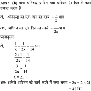 9. एक नाविक के रूप में अनिरूद्ध, अश्विन से दोगुना तेज है तथा वे मिलकर एक काम को 14 दिनों में समाप्त करते हैं। अकेला अश्विन कार्य को कितने दिनों में पूरा कर पायेगा?