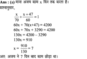 11. अजय और विजय किसी काम को क्रमश: 70 और 60 दिनों में कर सकते है। वे एक साथ काम करना शुरु करते है और कुछ समय बाद, अजय काम छोड़ देता है। विजय ने शेष काम को 47 दिनों में पूरा किया। अजय ने काम कब छोड़ा था?