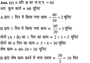 12. A किसी काम को 30 दिन में और B उसी काम को 20 दिन में समाप्त कर सकता है। A और B 6 दिन काम को साथ मिलकर करते हैं, और उसके बाद A काम छोड़कर चला जाता है। शेष बचे काम को B कितने दिनों में पूरा करेगा?