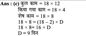 14. 18 व्यक्ति किसी काम को 12 दिनों में पूरा कर सकते हैं। काम के 4 दिन बाद, 2 श्रमिकों ने काम छोड़ दिया। श्रमिकों द्वारा काम छोड़ने के बाद से शेष काम कितने दिनों में पूरा होगा?