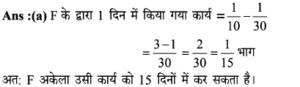 1. E तथा F मिलकर एक कार्य को 10 दिनों में कर सकते है। यदि E अकेला उसी कार्य को 30 दिनों में कर सकता है, तो बताएं कि F अकेला उसी कार्य को कितने दिनों में कर सकता है?