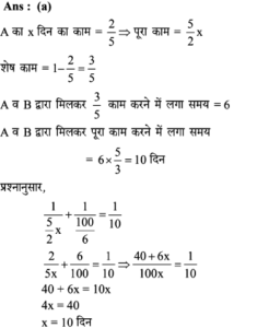 19. A एक काम का 2/5 भाग X दिनों में पूरा करता है। इसके बाद वह B को बुलाता है और वे एक साथ मिलकर 6 दिनों में शेष काम को समाप्त कर देते है। यदि B अकेले 100/6 दिन लेता है, तो X का मान ज्ञात कीजिए।