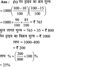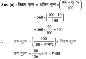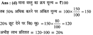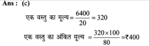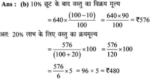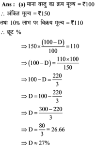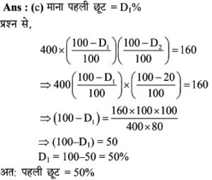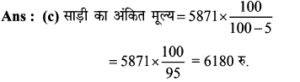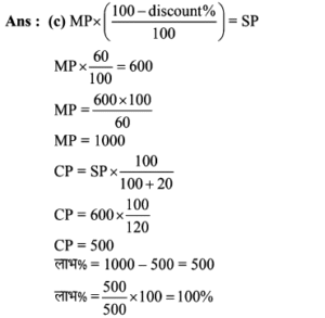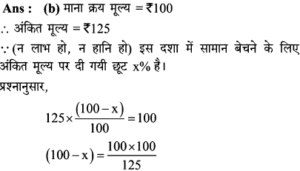 Aptitude | छूट (Discount) | Online Test – 03 Leave a Comment / Math Aptitude / By admin 0% Rajasthan GK In HindiAptitude | छूट (Discount) | Online Test - 03 1 / 141. शीला अपने ग्राहकों को अंकित मूल्य पर अधिकतम कितने % की छूट दे सकती है कि उसे अपना सामान बेचने पर ना तो लाभ हो और ना ही हानि हो, यदि उसने पहले से ही क्रय मूल्य 25% ज्यादा अंकित कर रखी हो? 25% 20% 30% 40% 2 / 142. अंकित कीमत पर 40% छूट देने पर भी एक जैकेट 20% लाभ पर 600 में विक्रय किया गया। यदि यह अंकित कीमत पर बेचा जाता है तो प्रतिशत लाभ क्या होगा। 50% 75% 100% 125% 3 / 143. राम नरेश एक बैग खरीदता है जिसका अंकित मूल्य 400 रूपये है, वह इसे दो क्रमागत छूट के बाद 160 रूपये में खरीदता है। यदि दूसरी छूट 20% है, तो पहली छूट ज्ञात कीजिए। 40% 30% 50% 80% 4 / 144. मुकेश ने एक बाइक 20000 रूपये के अंकित मूल्य पर क्रमशः 10% और 15% बढ़ती छूट के बाद खरीदी। 700 रूपये बीमा और मरम्मत पर व्यय किये। फिर उसने यह बाइक 20000 रूपये में बेच दी। लाभ प्रतिशत ज्ञात कीजिए। कोई लाभ नहीं 25% 30% 35% 5 / 145. अपर्णा एक वस्तु पर उसके क्रय मूल्य से 50% अधिक मूल्य अंकित करती है। लगभग 10% लाभ पाने के लिए कितने प्रतिशत छूट दी जानी चाहिए? 27% 25% 35% 37% 6 / 146. एक दुकानदार एक वस्तु की कीमत 640 रूपये अंकित करता है। यदि 10% की छूट के बाद भी वह क्रय मूल्य पर 20% लाभ कमाता है, तो वस्तु का क्रय मूल्य ज्ञात कीजिए ? 560 480 600 700 7 / 147. एक व्यापारी ने एक वस्तु पर 50% अधिक मूल्य अंकित किया तथा बाद में उस पर 20% की छूट दी। छूट देने के बाद व्यापारी को कितने प्रतिशत लाभमिला? 30% 125% 25% 20% 8 / 148. छोटी तथा बड़ी कॉपियों पर अंकित मूल्य क्रमशः 10 रुपये तथा 15 रुपये है। एक छात्र 5 दर्जन छोटी कॉपी तथा 10 दर्जन बड़ी कॉपी 5% की कुल छूट पर खरीदता है। छूट की राशि ज्ञात कीजिए। 100 110 120 130 9 / 149. 20 वस्तुओं का एक बॉक्स 20% की छूट के बाद 6400 में खरीदा गया। प्रत्येक वस्तु की कीमत बताइए? 300 350 400 450 10 / 1410. एक दुकानदार 1000 अंकित मूल्य वाला एक पैन ड्राइव क्रमिक रूप से क्रमशः 10 प्रतिशत और 15 प्रतिशत की छूट के बाद खरीदता है। यदि वह 35 रुपये पैक करवाने में खर्च करता है और 1,000 में इसे बेच देता है तो उसका लाभ प्रतिशत ज्ञात कीजिए। कोई लाभ नहीं 25% 30% 35% 11 / 1411. पार्टी एक बेड 22% की छूट के बाद 16,725 में खरीदता है। बाद में वह यह पाता है कि यही स्टोर उस बेड को ऑनलाइन 15% छूट के बाद 15,685 में बेच रहा था। स्टोर से खरीदे गए बेड के अंकित मूल्य और ऑनलाइन बेड के अंकित मूल्य में क्या अन्तर है? (निकटतम में पूर्णांकित) 2989 2785 2897 2888 12 / 1412. एक साड़ी 5% की छूट के बाद 5871 में बेची जाती है। उसका अंकित मूल्य ज्ञात कीजिए। 5577 6880 6180 5734 13 / 1413. एक दुकानदार 2000 अंकित मूल्य वाला एक स्टीरियो सिस्टम क्रमशः 10% और 15% की छूट के बाद खरीदता है। वह 70 पैक करवाने में खर्च करता है और 2000 में इसे बेच देता है। दुकानदार का प्रतिशत लाभ बताइये। कोई लाभ नहीं 25% 30% 35% 14 / 1414. एक दुकानदार अपने ग्राहक को किसी वस्तु के अंकित मूल्य पर 10% छूट देता है, फिर भी वह 26% लाभप्राप्त करता है। यद