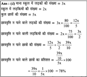 11. किसी स्कूल में लड़कों और लड़कियों की संख्या का अनुपात 3:2 है। यदि 20% लड़कों और 25% लड़कियों को छात्रवृत्ति प्राप्त होती है, तो कितने प्रतिशत छात्रों को छात्रवृत्ति प्राप्त नहीं होती है?