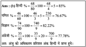 12. यदि अन्जू हिन्दी के 80 अंक में 68, गणित में 60 में से 46 अंक और विज्ञान में 90 अंक में से 74 तथा अंग्रेजी में 45 में से 35 अंक प्राप्त करती है तो अंजू कौन-से विषय में अधिकतम प्रतिशत अंक प्राप्त की?