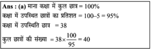 16. एक कक्षा में, किसी दिन 5% छात्र अनुपस्थित है। यदि उपस्थित छात्रों की संख्या 38 है, तो उस दिन कक्षा में छात्रों की कुल संख्या कितनी है ?