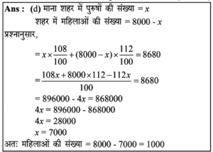 7. एक शहर की जनसंख्या 8000 है। यदि पुरुषों की संख्या में 8% और महिलाओं की संख्या में 12% की वृद्धि होती है तो जनसंख्या 8680 हो जाएगी। शहर में महिलाओं की संख्या ज्ञात करें।