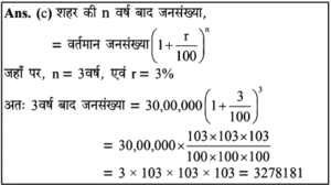 9. एक शहर में, प्रत्येक वर्ष, वर्ष के आरंभ में लोगों की संख्या में 3% प्रतिशत वृद्धि हुई। यदि उस शहर की वर्तमान जनसंख्या 30,00,000 है, तो 3 वर्षों के बाद जनसंख्या होगी।