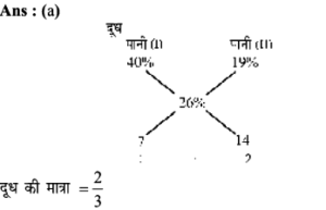 2. दूध के एक जार मे 40% पानी है। इसके एक हिस्से को दूसरे दूध से बदल दिया जाता है, जिसमें 19% पानी है अब पानी का प्रतिशत 26% है। दूध की कितनी मात्रा को बदला गया ?