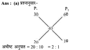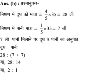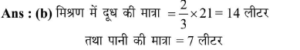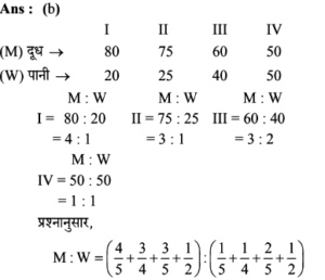17. दो बर्तनों में दूध और पानी का अनुपात 2:3 तथा 7:3 है, दोनो बर्तनों के मिश्रण को मिलाने पर (तीसरे नए बर्तन में) प्राप्त नए मिश्रण में दूध और पानी का अनुपात ज्ञात कीजिए।