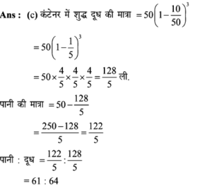 3. 50 लीटर शुद्ध दूध वाले एक कंटेनर से, 10 लीटर दूध निकालकर 10 लीटर पानी डाला जाता है। यदि इस प्रक्रिया को तीन बार दोहराया जाता है, तो अंततः पानी और दूध के बीच क्या अनुपात है ?