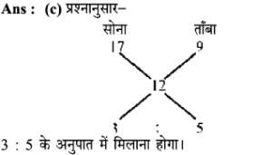 9. सोना, पानी से 17 गुना भारी है और तांबे से 9 गुना भारी है। किस अनुपात में धातुओं का मिश्रण किया जाना चाहिए। ताकि वे पानी से 12 गुना भारी हो जाए।