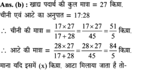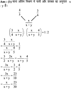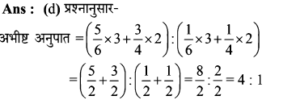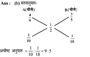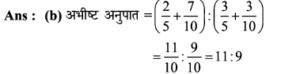 11. दो बर्तनों, A और B में चीनी और पानी के मिश्रण का अनुपात 4 : 5 तथा 3 2 है। आधी चीनी और आधा पानी का नया मिश्रण प्राप्त करने के लिए इन दोनों मिश्रणों को किस अनुपात में मिलाया जा सकता है?