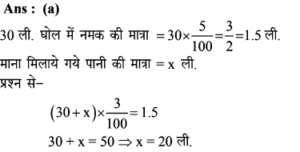 12. 30 लीटर नमक के घोल (solution) में 5% नमक है। इस घोल में कितने लीटर पानी और मिलाया जाना चाहिए ताकि परिणामी घोल में नमक की मात्रा 3% हो।