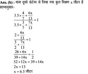 16. दो कंटेनर में शहद और पानी का अनुपात क्रमश: 4:3 और 6:7 होता है। दूसरे कंटेनर में शहद और पानी का समान अनुपात प्राप्त करने के लिए अन्य कंटेनर से कितने मिश्रण (लीटर में) को पहले कंटेनर से 3.5 लीटर मिश्रण के साथ जोड़ा जाता है?