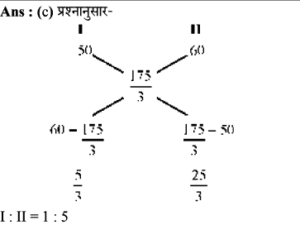 18. चावल की दो किस्मों का मूल्य क्रमशः रुपए 50 प्रति किलो और रुपए 60 प्रति किलो है, जो कुछ अनुपात में -मिश्रित की जाती हैं, और मिश्रित चावल को रुपए 70 प्रति किलोग्राम पर बेचा जाता है, जिससे 20% लाभ प्राप्त हो सके। वह अनुपात क्या है जिसमें दोनों चावल की किस्मों को मिलाया जाता है?