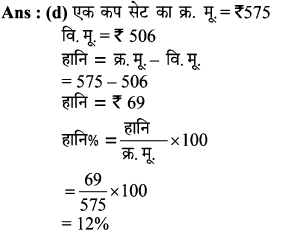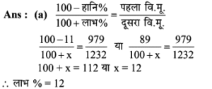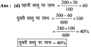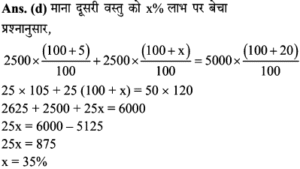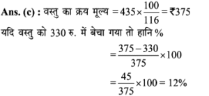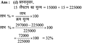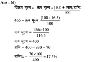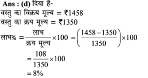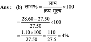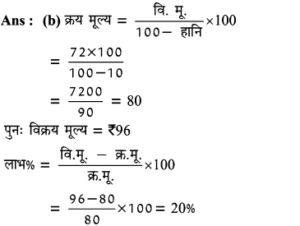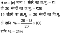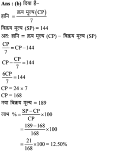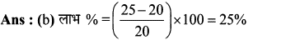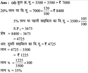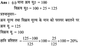 Aptitude | लाभ व हानि (Profit and Loss) | Online Test – 01 1 Comment / Reasoning Question / By admin 0% Rajasthan GK In HindiAptitude | लाभ व हानि (Profit and Loss) | Online Test - 01 1 / 201. हीरु ने 47,000 में पुरानी कार खरीदी और इसकी मरम्मत में 3000 खर्च किए। यदि वो कार को 58,000 में बेचता है, तो उसके लाभ का प्रतिशत कितना होगा? 18% 16% 17% 15% 2 / 202. 25 वस्तुओं का क्रय मूल्य 20 वस्तुओं के विक्रय मूल्य के समान है। लाभ प्रतिशत ज्ञात कीजिए। 50% 25% 40% 30% 3 / 203. किसी उत्पाद की बिक्री पर हुआ लाभ 25% है। यदि क्रय मुल्य और विक्रय मूल्य के मानों को परस्पर बदल दिया जाए, तो कितने प्रतिशत की हानि होगी? 12% की हानि 16% की हानि 20% की हानि 25% की हानि 4 / 204. दो वस्तुओं जिनमें प्रत्येक का क्रय मूल्य ₹2500 है। एक को 5% लाभ पर बेचा जाता है। यदि कुल मिलाकर 20% का लाभ हुआ हो, तो अन्य दूसरी वस्तु की बिक्री पर हुआ प्रतिशत लाभ ज्ञात कीजिए। 20% 25% 30% 35% 5 / 205. कावेरी ने एक खिलौना ₹280 में खरीदा और इसे ₹315 में बेच दिया। उसे कितना लाभ प्राप्त हुआ? 17.5% 12.5% 16% 15.25% 6 / 206. कार्यक्रमों के लिए गीता केक बनाती है। जन्मदिन की पार्टी के लिए, उसने एक केक बनाया और इसे ₹ 700 में बेच दिया। केक बनाने के लिए सामग्री की लागत कीमत ₹ 350 थी। उसके लाभ मार्जिन का प्रतिशत क्या है? 200% 50% 100% 150% 7 / 207. एक पेन को 144 में बेचने पर अनुराग को क्रय मूल्य पर 1/7 की हानि होती है। यदि पेन 189 में बेचा जाता है, तो लाभ प्रतिशत क्या होगा? 11% 12.5% 11.5% 14% 8 / 208. यदि 15 संतरों का क्रय मूल्य 20 संतरों के विक्रय मूल्य के बराबर है तो हानि प्रतिशत है : 30% 75% 25% 40% 9 / 209. शेफाली ने कप का एक सेट ₹ 575 में खरीदा, लेकिन बाद में पुराना माल निकालने के लिए ₹506 में बेच दिया। उसे कितने प्रतिशत नुकसान हुआ? 13% 14% 16% 12% 10 / 2010. एक आदमी 1 रुपये में 5 पेन खरीदता है और 1 रुपये के 4 बेचता है। उसका लाभ प्रतिशत ज्ञात कीजिए। 25% 50% 40% 20% 11 / 2011. 16.5% लाभ समेत एक वस्तु का बिक्री मूल्य ₹466 था। यदि उस वस्तु को ₹330 में बेच गया होता तो कितने प्रतिशत नुकसान होता? 17.25 17.75 17 17.5 12 / 2012. दो वस्तुओं का क्रय मूल्य 200 और 600 है। एक दुकानदार दोनों को बेचकर 300 का लाभ अर्जित करता है। यदि दुकानदार ने पहली वस्तु को 30% लाभपर बेचा है, तो वह दूसरी वस्तु को किस लाभ पर बेचता है? 50% 20% 30% 40% 13 / 2013. एक आदमी ने 20% के कुल लाभ पर दो साइकिलें बेचीं। यदि उसने उन्हें प्रत्येक को 3,500 में खरीदा था और 5% के लाभ पर पहले व्यक्ति ने बेचा था, तो कितना लाभ (%) उसे दूसरे से होना चाहिए? 20% 30% 25% 35% 14 / 2014. एक पायदान को ₹72 में बिक्री करने पर बढ़ई को 10% की हानि होती है। ₹ 96 में पायदान को बेचने पर उसे कितने प्रतिशत की लाभ अथवा हानि होगी? लाभ, 10% लाभ, 20% हानि, 16% हानि, 25% 15 / 2015. एक दुकानदार को एक वस्तु 979 रूपये में बेचने पर 11% की हानि होती है। यदि दुकानदार उस वस्तु को ₹1232 में बेचता है, तो लाभ% है- 12% 21% 11% 14% 16 / 2016. मि० राजेश 27.50 के एक खिलौना खरीदता है और इसे 28.60 के लिए बेचता है तो प्रतिशत लाभ है। 5% 4% 6% 3% 17 / 2017. प्रत्येक 15,000 की दर से 15 लैपटाप खरीदे गये और सभी को 2.97 लाख में