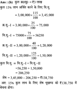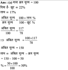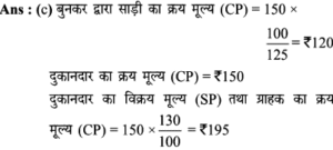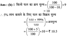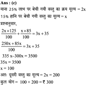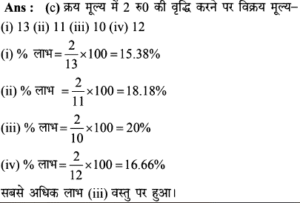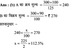 Aptitude | लाभ व हानि (Profit and Loss) | Online Test – 07 Leave a Comment / Math Aptitude / By admin 0% Rajasthan GK In HindiAptitude | लाभ व हानि (Profit and Loss) | Online Test - 07 1 / 101. एक फल विक्रेता 9 प्रति किलो की दर से आम बेचता है और इस पर उसे 10% की हानि होती है। 5% का लाभ कमाने के लिए उसे कितने रुपये प्रति किलो की दर से आम बेचने चाहिए? 10 10.5 9.5 11.11 2 / 102. 'A', 'B' को 25% लाभ पर 300 में माल बेचता है। 'B' इसे 10% हानि पर 'C' को बेचता है। इस सौदे में, C का क्रय मूल्य, A के क्रय मूल्य के कितने प्रतिशत के बराबर है ? 97.5% 112.5% 87.5% 110% 3 / 103. बेला एक किसान है। उसके पास कुछ एकड़ जमीन है। पिछले महीने, उसकी अच्छी फसल हुई थी जिसने उसे अपने प्रारंभिक निवेश पर 90% लाभ (जो लगभग 90,000 था) दिया था। लगभग हर मौसम में निवेश करने के लिए उसे कितना पैसा चाहिए? 1,00,000 3,00,000 6,00,000 1,50,000 4 / 104. अस्थिर बाजार में एक वस्तु भिन्न तिथियों पर (ⅰ) 11, (ii) 9, (iii) 8 तथा 10 के यूनिट मूल्यों पर खरीदी गई। इसे इसके क्रय मूल्य से 2 रूपये अधिक मूल्य पर बेचा गया। प्रतिशत में सबसे अधिक लाभ किस वस्तु पर हुआ? (i) (ii) (iii) (iv) 5 / 105. एक बुनकर 150 की कीमत पर दुकानदार को एक साड़ी बेचता है और 25% लाभ प्राप्त करता है। दुकानदार 30% लाभ के साथ वही साड़ी एक ग्राहक को बेचता है। यदि बुनकर सीधे ग्राहक को साड़ी रु. 180 पर बेच सकता, तो उसका लाभ % और ग्राहक का लाभ रुपये में क्या होता? 50% 25 60%, 20 50%,15 40% 20 6 / 106. जॉन चार पुराने ट्रैक्टर 2 लाख रुपये में खरीदता है। उसने इन चार ट्रैक्टरों के रख-रखाव और मरम्मत में कुल 3 लाख खर्च किए। यदि वह चार ट्रैक्टर से एक ट्रैक्टर पहले से ही 1 लाख रुपये में बेच देता है, तो 40 प्रतिशत कुल लाभ प्राप्त करने के लिए बाकी 3 ट्रैक्टरों का औसत विक्रय मूल्य क्या है? 1.5 लाख 1.2 लाख 2 लाख 2.3 लाख 7 / 107. एक दुकानदार ने दो वस्तुओं को, एक को 25% लाभपर और दूसरे को 15% नुकसान पर बेचा और 35 का लाभ मिला। यदि 25% लाभ पर बेची गई वस्तु का मूल्य 15% हानि पर बेची गई वस्तु की तुलना में दोगुना है, तो दोनों वस्तुओं की लागत मूल्य का योग ज्ञात करें- 100 400 300 200 8 / 108. रीमा 75,000 में एक कार खरीदती है। वह इसकी रिपेयरिंग पर 10,000 खर्च करती है। बाद में उसने यह कार चीरू को 15% के लाभ पर बेच दी। चीरु ने इसे रितु को 10% लाभ पर बेच दिया। रितु ने कार खरीदने के लिए कितनी राशि खर्च की? 1,02,575 1,05,752 1,02,252 1,07,525 9 / 109. एक व्यक्ति 3 लाख में जमीन खरीदता है। वह इसका 25% हिस्सा 25% हानि पर और 40% हिस्सा 25% लाभपर बेचता है। कुल 15% लाभ अर्जित करने के लिए उसे बाकी बचे भूखण्ड को कितने रूपए में बेचना होगा? 1,37,500 1,38,750 1,34,500 1,45,000 10 / 1010. 22% छूट देने के बाद भी 17% लाभ प्राप्त करने के लिए किसी वस्तु का अंकित मूल्य, उसके क्रय मूल्य से कितना अधिक होना चाहिए? 50% 35% 28% 45% Your score is Facebook 0% Restart quiz