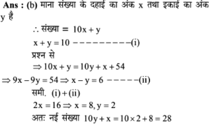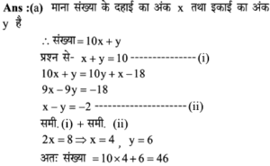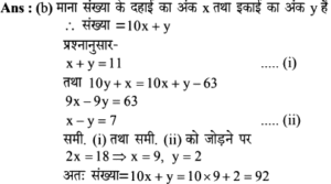 4. दो अंको की एक संख्या के अंको का योग 11 है। यदि अंकों के स्थान आपस में बदल दिए जाते हैं तो संख्या 63 कम हो जाती है। संख्या ज्ञात कीजिए।