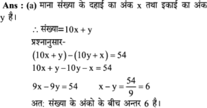 11. एक दो अंको की संख्या और संख्या के अंको को परस्पर बदल लेने से प्राप्त संख्या के बीच अंतर 54 है। उस संख्या के दोनों अंको के बीच क्या अंतर है?