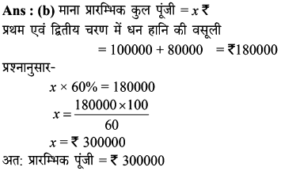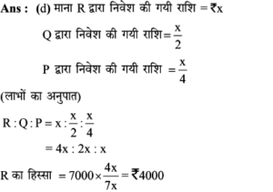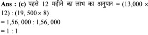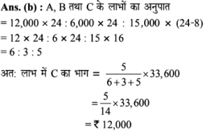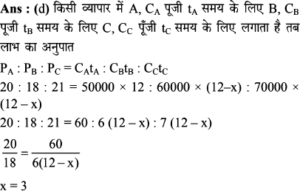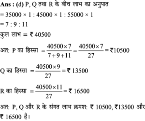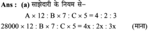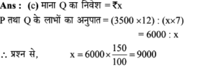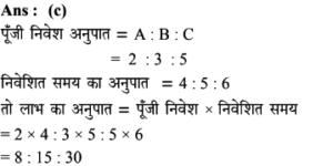 Aptitude | साझेदारी (Partnership) | Online Test – 01 Leave a Comment / Math Aptitude / By admin 0% Rajasthan GK In HindiAptitude | साझेदारी (Partnership) | Online Test - 01 1 / 201. P एक व्यवसाय में 3500 का निवेश करता है। 5 महीनों के बाद कुछ निवेश के साथ उससे जुडता है। यदि को मिलने वाला लाभ P के लाभ से 50% अधिक हो, तो का निवेश ज्ञात कीजिए। 7000 5000 9000 6500 2 / 202. एक व्यवसाय में P, Q से आधा और Q, R के आधा निवेश करता है। 7000 मासिक लाभ को यदि उनके बीच साझा किया जाता है, तो R का हिस्सा क्या होगा? 2000 3000 1000 4000 3 / 203. X और Y ने एक व्यवसाय आरंभ किया। X ने 8,000 का निवेश किया और Y ने 10,000 का निवेश किया। 6 महीने बाद, Z भी ₹6,000 के निवेश के साथ उस व्यवसाय में शामिल हो गया। यदि 3 वर्षों में 9,660 का लाभ होता है, तो Z का हिस्सा कितना है? 1,500 2,100 1,900 1,200 4 / 204. X, Y और Z 415 के वार्षिक किराये पर एक खेत लेते हैं। यदि X उस खेत में 25 गायों को 6 महीने, Y 40 गायों को 8 महीने और Z 30 गायों को पूरे वर्ष घास चराते हैं, तो दिए गए किराये में Y का हिस्सा कितना है? 120 154 150 160 5 / 205. A और B क्रमश: 12,000 और 6,000 का निवेश कर साझेदारी में एक बिजनेस शुरू करते हैं। 8 महीने बाद, 15,000 की पूंजी के साथ C भी बिजनेस में जुड़ जाता है। 2 वर्ष बाद 33,600 के लाभ में C का भाग कितना होगा? 15,000 12,000 10,000 22,000 6 / 206. P, Q और R 35000, 45000 और 55000 निवेश करके एक साझेदारी में प्रवेश करते हैं। 40500 के वार्षिक लाभ में उनका संगत हिस्सा ज्ञात कीजिए। 10500, 13500, 19500 10500, 13500, 18500 10500, 13500, 17500 10500, 13500, 16500 7 / 207. सुरभि ने किसी उद्योग में 5 महीने के लिए 6000 और उर्बा ने 6 महीने के लिए 5000 निवेश किये। लाभ में दोनों का अनुपात क्या होगा? 36:25 6:5 5:6 1:1 8 / 208. P और Q ने एक व्यवसाय में 5: 13 के अनुपात में निवेश किया । Q ने 6 महीने बाद अपनी पूंजी निकाल ली । यदि उन्होंने अपना लाभ 25:26 के अनुपात में साझा किया हो, तो Pकी राशि को कितने समय तक उपयोग की गई थी ? 8 महीने 15 महीने 18 महीने 12 महीने 9 / 209. A और B, क्रमशः 50000 और 60000 का निवेश करके एक साझेदारी में प्रवेश करते हैं। 'x' महीनों के बाद C भी 70000 निवेश करके उनके साथ जुड़ जाता है, वर्ष के अंत से 'x' महीने पहले B इस साझेदारी से निकल जाता है। यदि वे 20: 18: 21 के अनुपात में लाभ साझा करते हैं, तो 'x' का मान ज्ञात कीजिए। 4 6 5 3 10 / 2010. P और Q क्रमशः 1400 और 1800 के निवेश के साथ एक साझेदारी में प्रवेश करते हैं। वे लाभ के आधे हिस्से को व्यवसाय के संचालन के लिए रखते हैं और शेष हिस्से को अपने निवेश के अनुपात में बाँट लेते हैं। यदि लाभ में उनके हिस्सों का अंतर 47 है, तो कुल लाभ ज्ञात कीजिए। 752 804 954 504 11 / 2011. A, B और C ने 2: 3: 5 के अनुपात में पूंजी का निवेश किया, उनके निवेश के 'समय' का अनुपात 4 : 5: 6 है। तीनों के लाभ का अनुपात होगा : 08:15:20 05:15:30 08:15:30 07:15:30 12 / 2012. उर्मी और लोकेश ने क्रमशः 11,250 और 13,125 के निवेश के साथ साझेदारी शुरू की, लेकिन वित्तीय संकट के कारण इनमें से एक को अपने निवेश के 8 महीने बाद अपना निवेश निकालना पड़ा। पहले 12 महीनों के लाभ को दोनों में किस अनुपात में बाँटा जाना चाहिए? 7:9 9:7 7:6 6:7 13 / 2013. तरूण और तपन ने क्रमशः 1