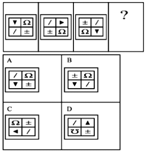 Reasoning | Series ( श्रृंखला) | Online Test – 06 Leave a Comment / Reasoning Question / By admin 0% 2 Rajasthan GK In HindiReasoning | Series ( श्रृंखला) | Online Test – 06 1 / 201. दी गई श्रृंखला में ‘?’ के स्थान पर कौन सी उत्तर आकृति आएगी?प्रश्न आकृतियाँ : उत्तर आकृतियाँ: A C D B 2 / 202. उस विकल्प आकृति का चयन करें जो प्रश्न आकृतियों की श्रृंखला को पूरा करेगा।प्रश्न आकृतियां: विकल्प आकृतियां: A C D B 3 / 203. दी गई प्रश्न श्रृंखला की अगली आकृति का चयन उत्तर आकृति श्रृंखला से कीजिए।प्रश्न आकृतिः उत्तर आकृतिः C A D B 4 / 204. निम्नलिखित श्रृंखला में प्रश्न चिह्न (?) को कौन सा चित्र प्रतिस्थापित करेगा। D A B C 5 / 205. प्रश्न आकृतियों की निम्नलिखित श्रृंखला में अगली आकृति, कौन सी विकल्प आकृति होगी?प्रश्न आकृतियांविकल्प आकृतियां D C A B 6 / 206. निम्न उत्तर चित्र से उस विकल्प का चयन कीजिए जो प्रश्न चित्र श्रृंखला में ‘?’ के स्थान पर आएगा?प्रश्न चित्रः उत्तर चित्र6. A C B D 7 / 207. वह आकृति चुनिए जो श्रृंखला को पूरा करेगी-प्रश्न आकृतिःउत्तर आकृतिः D A C B 8 / 208. श्रृंखला को पूर्ण करने के लिए सही विकल्प चुनें A B C D 9 / 209. उपयुक्त आकृति का चयन करें, जो खाली स्थान पर रखने से निम्न श्रृंखला पूर्ण हो जाय A B D C 10 / 2010. उपयुक्त आकृति का चयन करें, जो दी गई श्रृंखला को पूर्ण करें।प्रश्न आकृतियाँ: उत्तर आकृतियाँ:10. A C B D 11 / 2011. दी गई श्रृंखला के लिए अगली आकृति ज्ञात करें-प्रश्न आकृतियां: उत्तर आकृतियाँ D B D C 12 / 2012. चित्र श्रृंखला में प्रश्न चिन्ह (?) की जगह पर निम्न में से कौन सी आकृति आएगी? C B D A 13 / 2013. निम्न प्रश्न चित्र श्रृंखला का अगला चित्र उत्तर चित्रों से चुनें-प्रश्न चित्र : उत्तर चित्र : B C D A 14 / 2014. निम्न चित्र श्रृंखला में प्रश्न चिन्ह (?) के स्थान पर कौन सा चित्र उपयुक्त होगा? A D B C 15 / 2015. निम्न प्रश्न चित्र श्रृंखला के लिए अगले चित्र का चयन उत्तर चित्रों से कीजिए-प्रश्न चित्र : उत्तर चित्र :15. C A C D 16 / 2016. नीचे दिए गए विकल्प में ‘?’ के स्थान पर कौन सा विकल्प उपयुक्त होगा? C A B D 17 / 2017. नीचे दी गयी उत्तर आकृतियों के पैटर्न का अध्ययन करें और तय करें कि अगली आकृति कौन सी होगी? D B A C 18 / 2018. निम्नलिखित प्रश्न आकृतियों की श्रृंखला में प्रश्न चिन्ह (?) को कौन सी उत्तर आकृति प्रतिस्थापित करेगी?प्रश्न आकृतियाँ : उत्तर आकृतियाँ : A D C B 19 / 2019. निम्नलिखित प्रश्न आकृतियों की श्रृंखला में प्रश्न चिन्ह (?) को कौन सी उत्तर आकृति प्रतिस्थापित करेगी?प्रश्न आकृतियाँ : A B C D 20 / 2020. उस विकल्प का चयन करें जो निम्न श्रृंखला में आगे आएगा। A C D B Your score isThe average score is 35% Facebook Twitter 0% Restart quiz